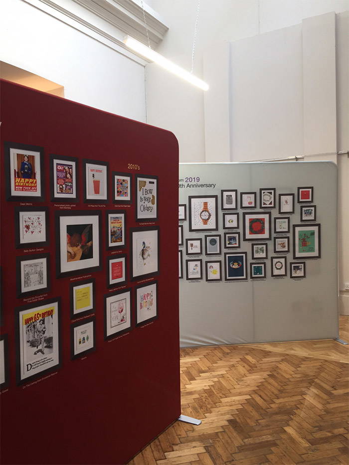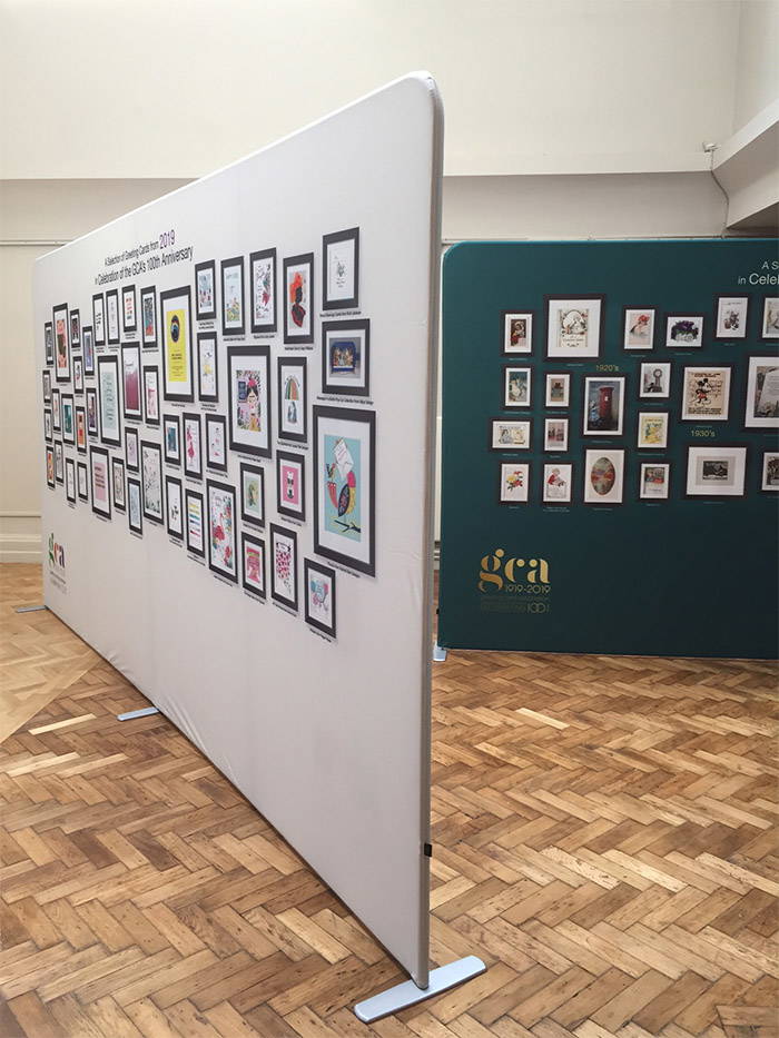 The exhibition consists of two fabric screens, on a folding frame, that can be easily transported. The first screen has cards from years 1919-1969 on one side and years 1970-2019 on the reverse. The second screen has a wide selection of gorgeous designs from 2019, demonstrating the broad range of innovation and design within our world-leading British greeting card industry, at a time when the British are spending £1.7bn a year on greeting cards.