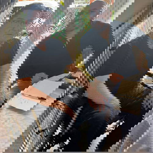 Matt Genower, Managing Director at Five Dollar Shake and Jimmy writing Five Dollar Shake cards