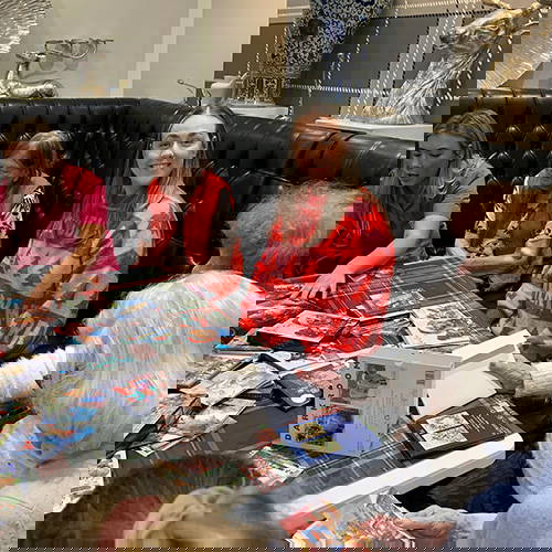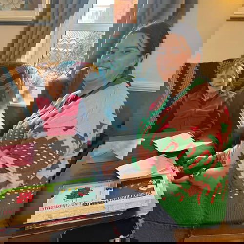 On 10th December, Sarah and Kel from Stormy Knight, along with Emily (Emily Nash Illustration) and James and Louise (James Ellis Designs), visited Bishopsmead Lodge Care Home in Bedminster Down, Bristol—marking their third year of visiting. They brought a selection of cards to write with the residents and delivered the cards made by Phoebe and her classmates to the 40 residents. James even brought his guitar and played and sang Christmas songs, adding an extra touch of festive cheer.