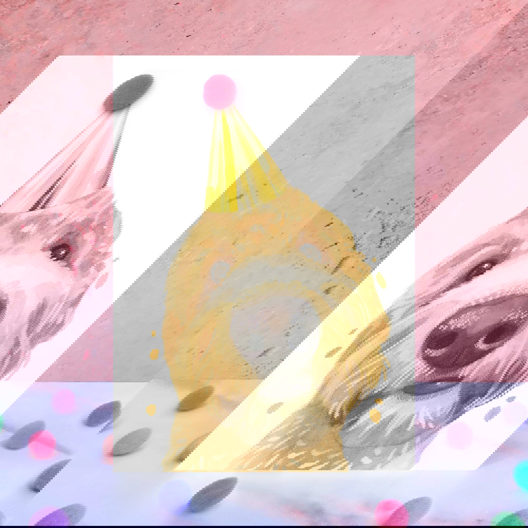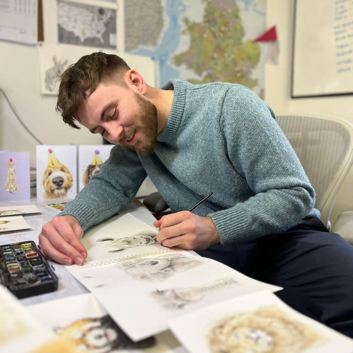 I have been painting professionally for seven years, delighting pet owners all over the world with my custom pet portraits. More recently, however, I have decided to create a range of products with my artwork. Beginning with a simple range of greeting cards featuring dogs who like to get up close and personal with the recipient, I now have ranges featuring a whole host of animals.