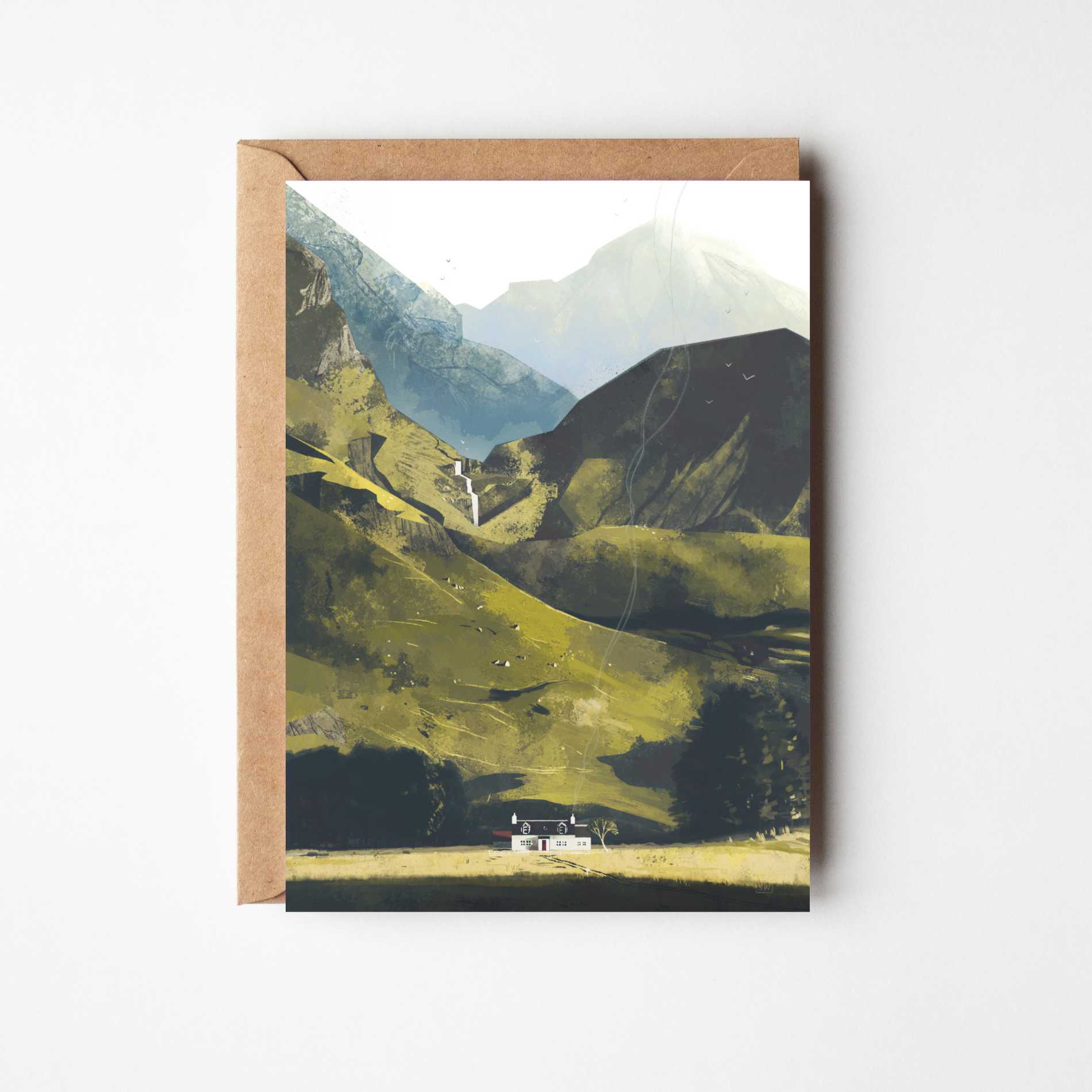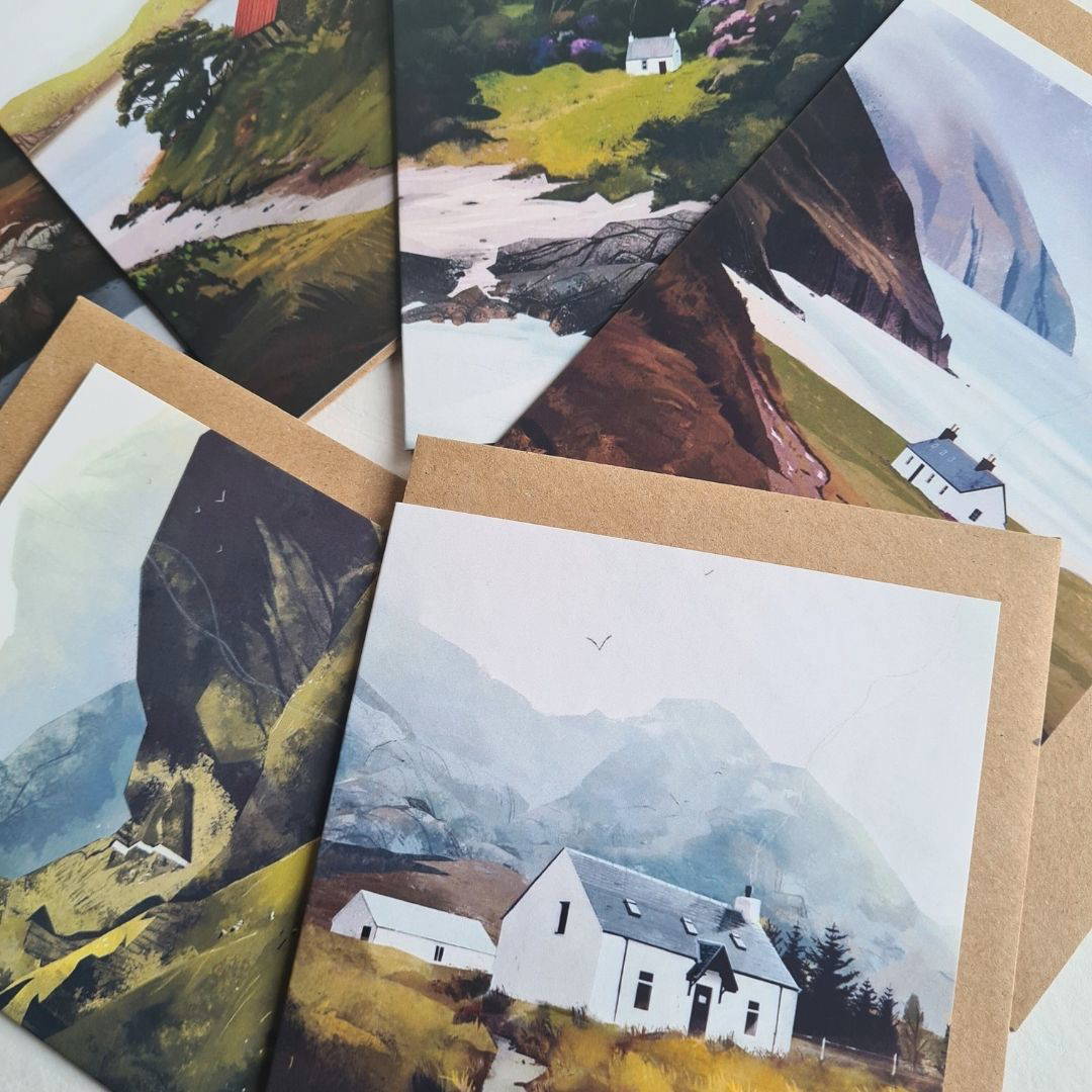 We are Sara Willia Landscapes, a wife and husband team based in Edinburgh. Sara illustrates the beautiful landscapes and Sonny runs the business side. We sell greeting cards of cabins and bothies across Northern Europe and the beautiful landscapes that surround them.