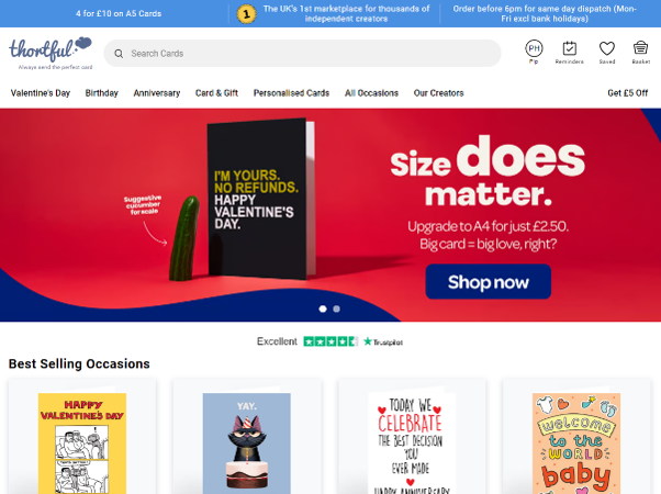 We’re an open marketplace that allows creators to upload greeting cards for sale. Because we’re digital-first, our cards are of the moment, with topical, trending content some of our best sellers and once a creator uploads and is moderated, they can be earning the very next day. Every card is human-moderated to ensure it’s socially acceptable and hits the mark on design creds. thortful then retail, print, pack and post cards from our Sheffield production centre. Every month, creators are paid a market-leading royalty for the cards they sold in the month whilst staying in control of their copyright.