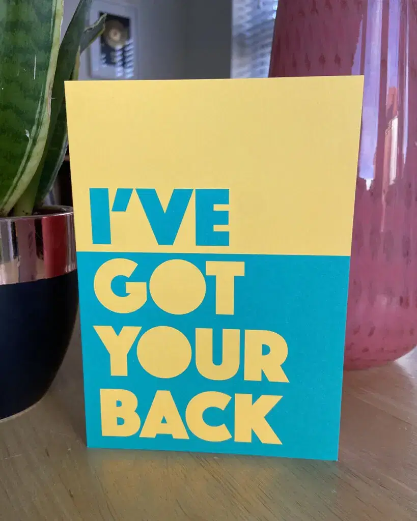 Again, it all comes down to simplicity in both words and design. Words like ‘Here for you mate’ or ‘I’ve got your back’ feel relevant and are the kinds of phrases people would actually say to each other. There really isn’t much more to say on the inside of the card either, that short sentence could be everything that’s needed.
