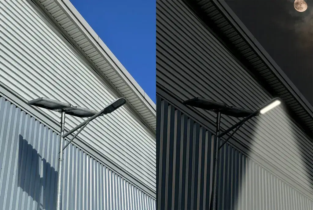 PIR motion-based lighting means lights only come on when infrared energy from people is detected, and the factory is split into sections so, when people are only in one area, the rest can be 75% dark, and the outside lights are photovoltaic lanterns powered by solar panels, which only come on when required.